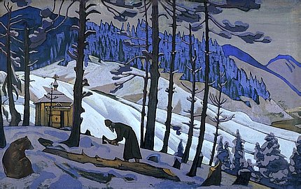 Das Nicholas Roerich Porträt auf den Hintergrung L